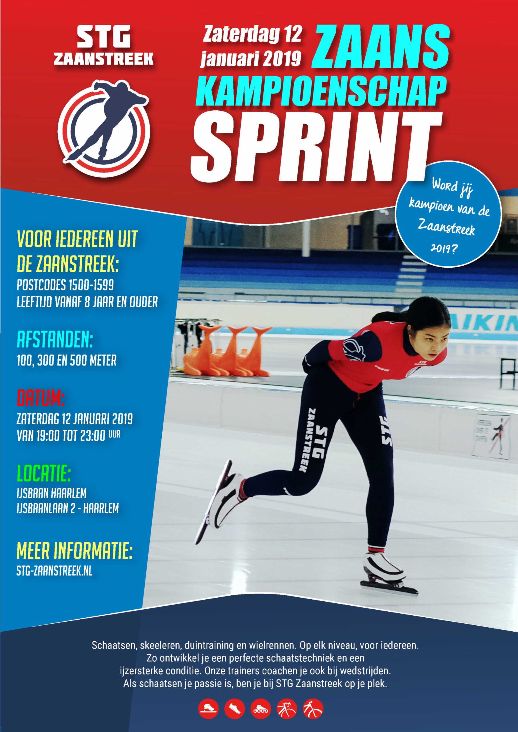 Op zaterdag 12 januari organiseert STG-Zaanstreek het tweede Open Zaans Kampioenschap Sprint. De wedstrijd gaat over 100, 300 en 500m en staat open voor iedereen, lid of geen lid, uit de Zaanstreek (postcodes 1500-1599). Uiteraard ook voor leden van STG-Zaanstreek die hierbuiten wonen. De wedstrijd is op de IJsbaan Haarlem en begint om 20.00 uur. Meer informatie over het inschrijven vind je in de agenda. Deel onderstaande flyer met je vrienden, familie, collega’s en iedereen die wel eens een schaatswedstrijd wil proberen, en nodig ze uit.