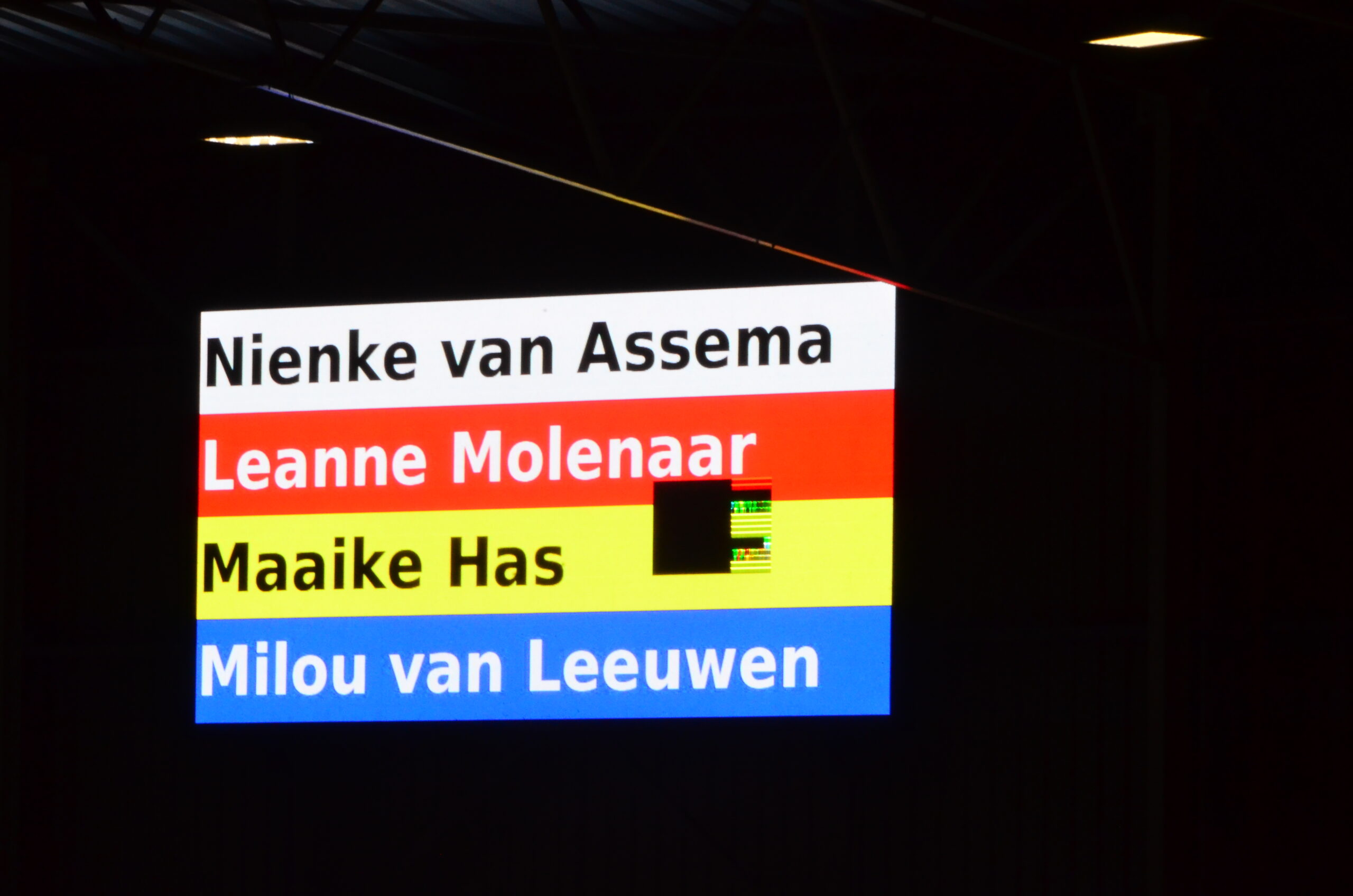 Op naar huis en uitrusten voor de zondag. Rond 23 uur waren we terug. Zondag wilde Nienke ineens uitfietsen op de Tacx. Papa kon onverwacht “mekanieker” spelen, want de fiets was na afgelopen zomer nog niet fietsklaar. Half vier ging de stoet weer op weg, nu richting de Uithof in Den Haag. Binnen gekomen waren alle deuren gesloten. Een teken? Alleen de ijshockeyhal was toegankelijk, maar daar hadden ze geen tijd voor ons. Veel te druk met elkaar tegen de boarding beuken. Via een nooduitgang (ingang??) kwamen we met wat hulp bij het ijs en daar bleken wij de verkeerde ingang gekozen te hebben. Net binnen, werd omgeroepen dat we nog 5 minuten hadden om de presentielijst te tekenen. Daarna zouden de startlijsten gemaakt worden. Vreemd. Waar in Breda aanmelding niet nodig was, moest dat in Den Haag dus wel. Gelukkig waren we net op tijd.