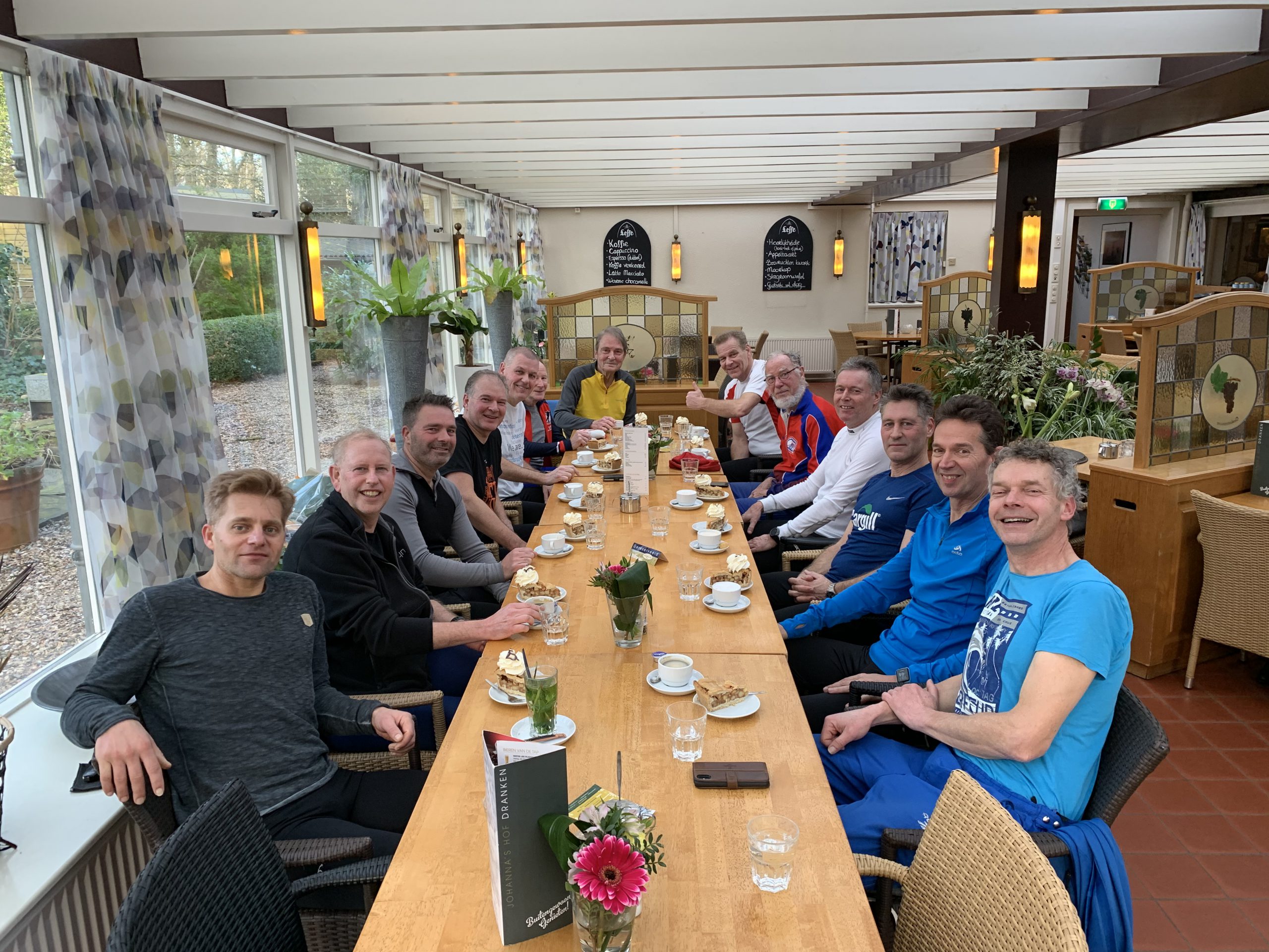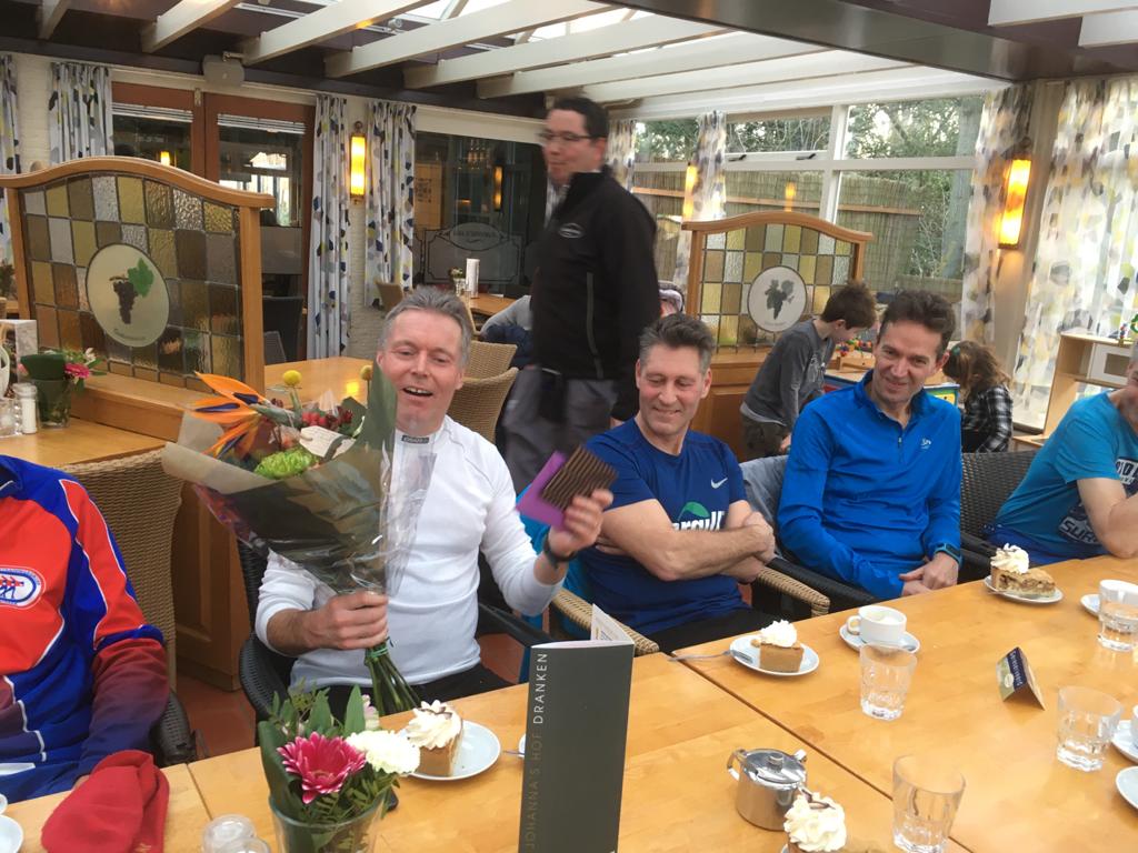 Onze ijs- en duintrainer, wedstrijdrijder (langebaan en marathon) Erwin Dekker is sinds vorige week de 60 jaar gepasseerd. Om dat niet zomaar voorbij te laten gaan hebben de trouwe leden na de wekelijkse zondagse duintraining bij Johanna’s Hof Erwin in het zonnetje gezet met een bonnetje en een bloemetje.