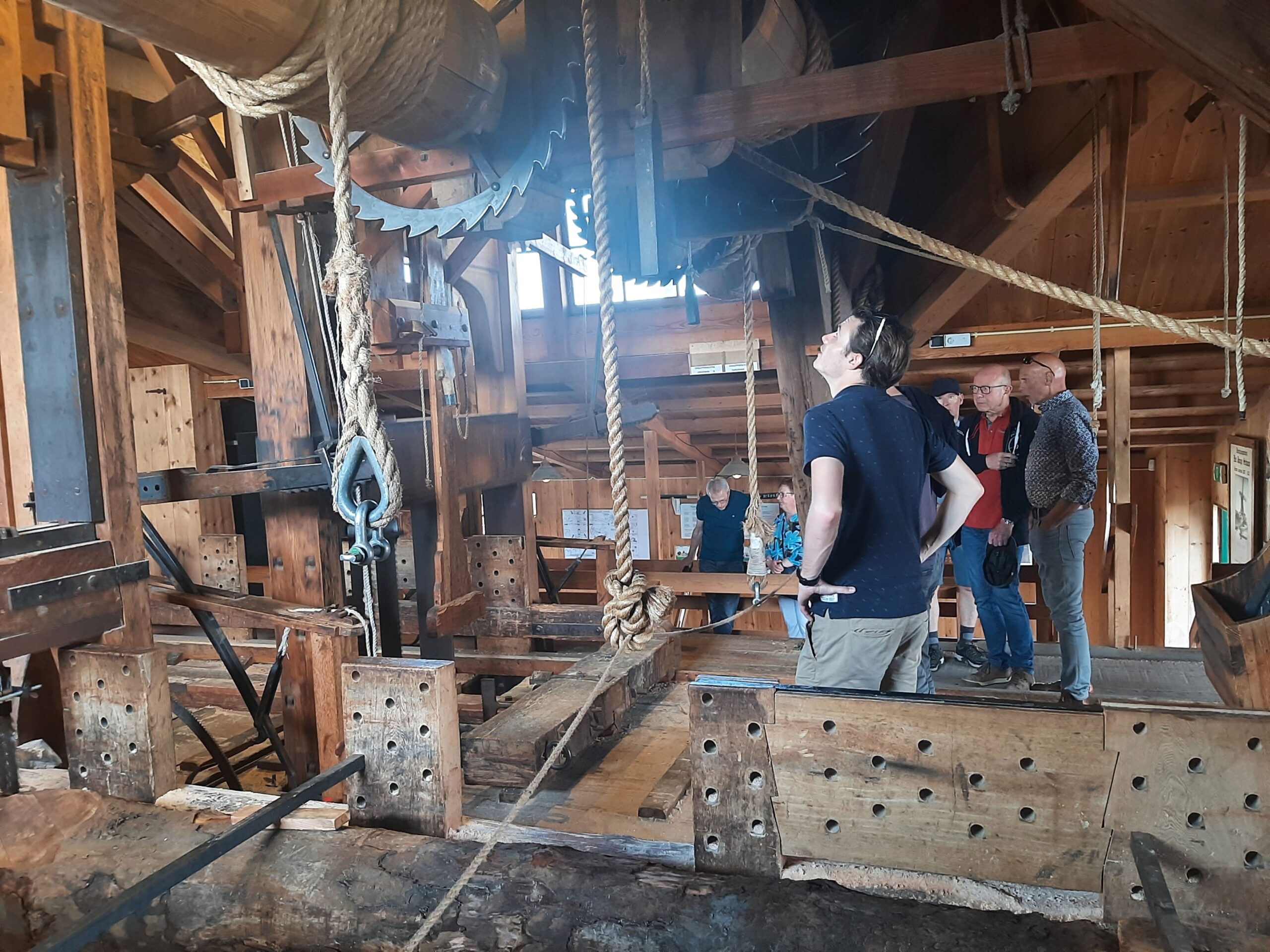 Mede door het vrijwilligerswerk van o.a. Peter Moerland al jaren bij molen ‘Het jonge Schaap’, was er ook een rondleiding in de herbouwde houtzaagmolen aan de Kalverringdijk. Dat schaatsen een technische sport is werd snel duidelijk toen uitgelegd werd hoe de zagen van de molen geslepen moesten worden, op gevoel en gehoor! Met veel interesse werden de bewegende zaagramen gadegeslagen en het hout geaaid en beklopt, als waren het een paar schaatsen.